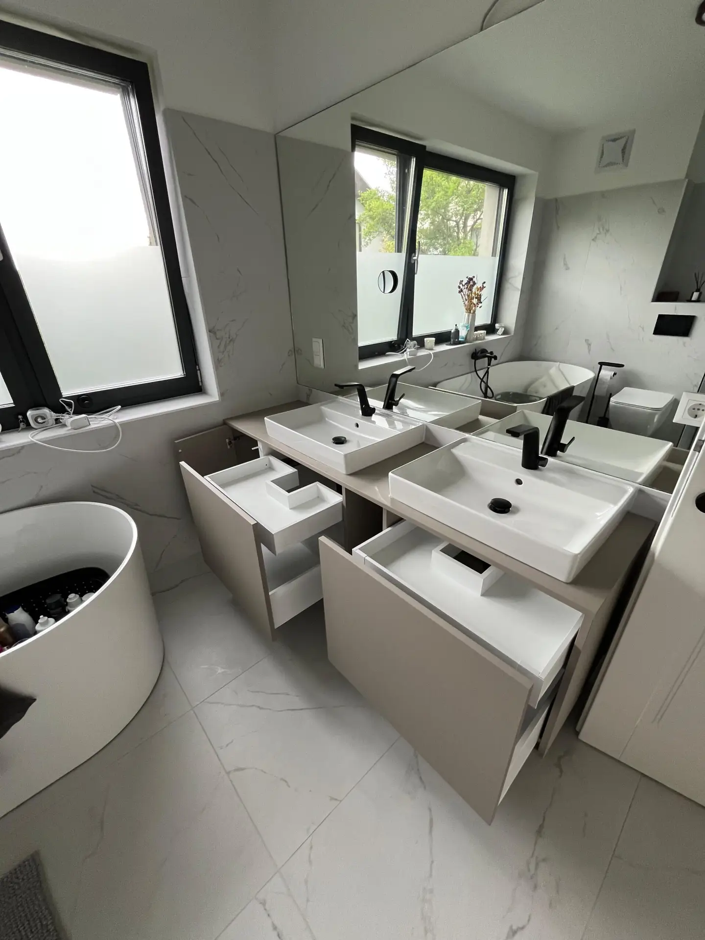 Dieses stilvolle Badezimmer kombiniert elegantes Design mit funktionaler Ausstattung. Die hochwertigen Schrankelemente in Eiche bieten optimalen Stauraum und fügen sich harmonisch in das edle Ambiente mit schwarzen Marmorfiesen ein. Besonders praktisch: Der integrierte Wäschekorb und die durchdachten Schubladen ermöglichen eine effiziente Organisation. Dezente LED-Beleuchtung setzt gezielte Akzente und sorgt für eine angenehme Atmosphäre. Perfekt für ein modernes und aufgeräumtes Badezimmer.