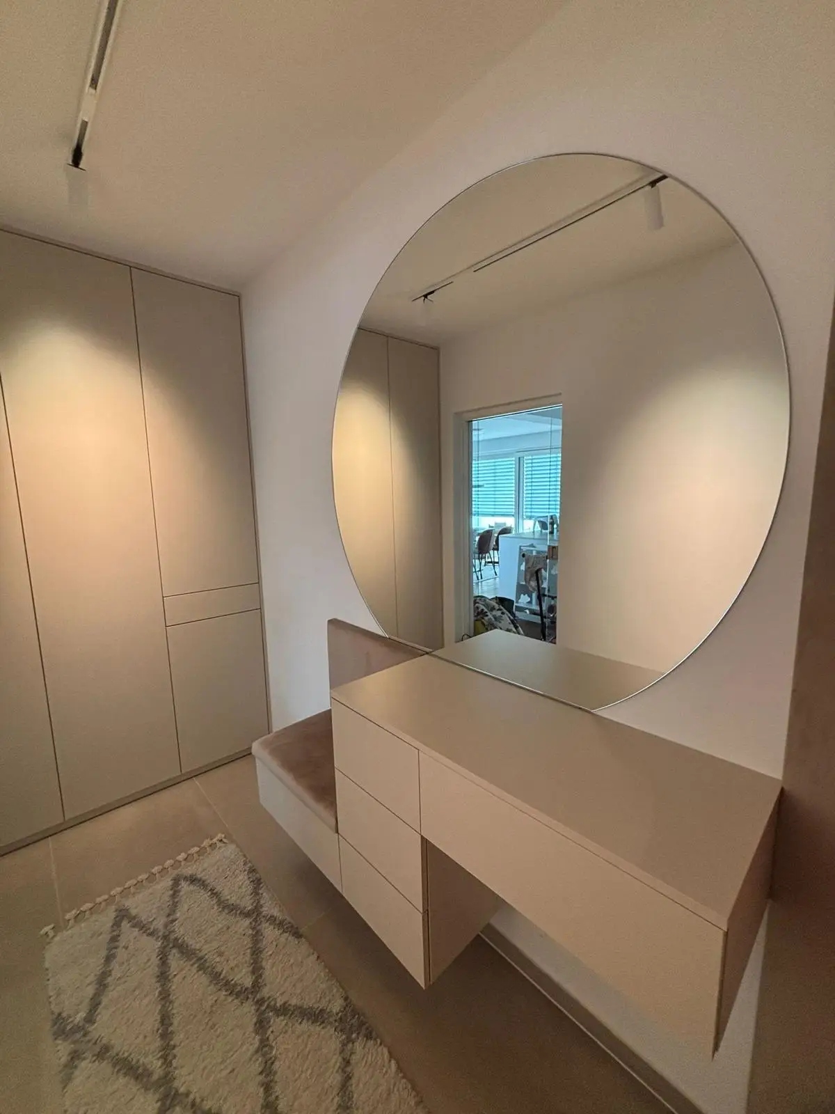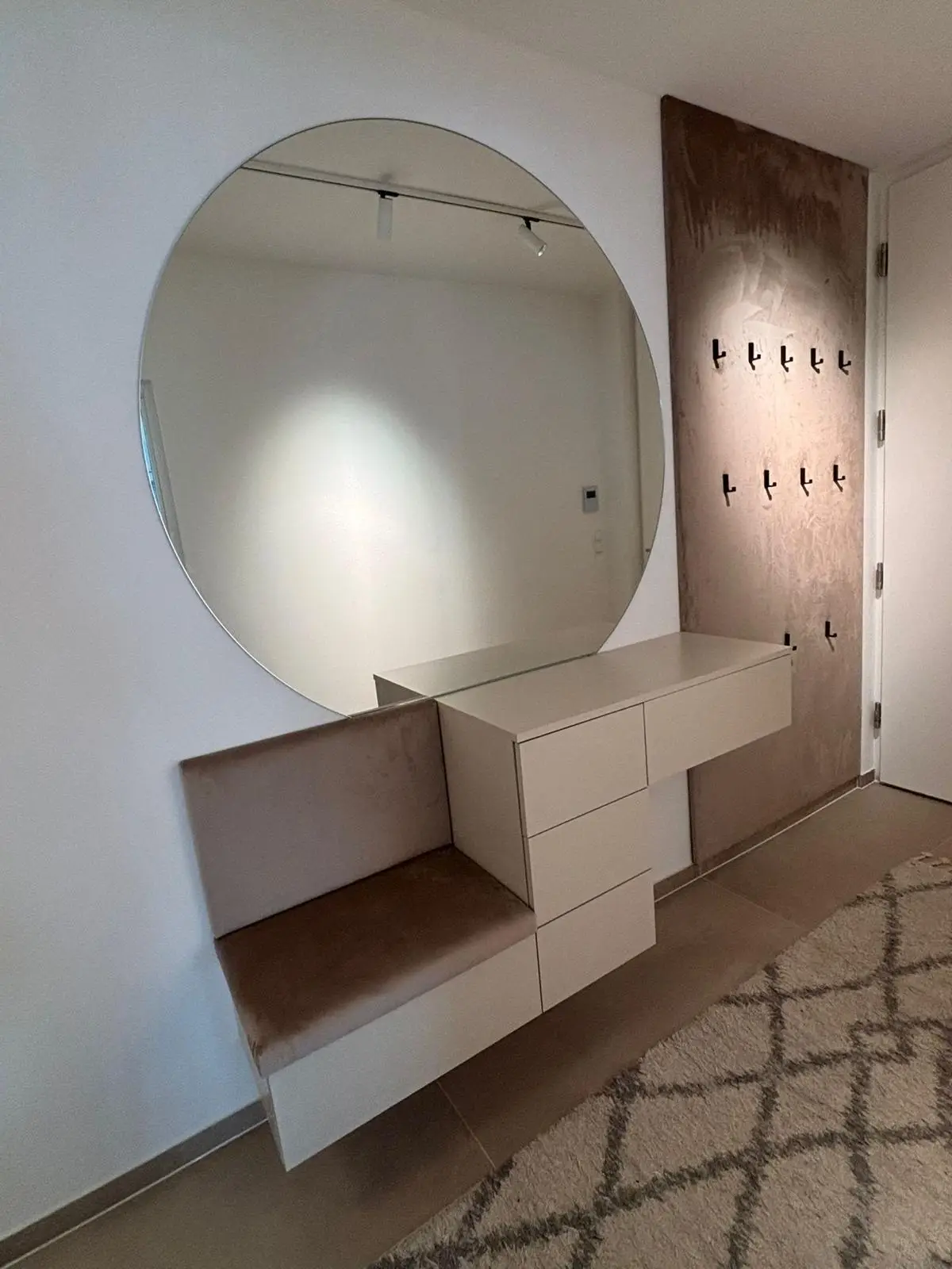 Ein maßgefertigter, moderner Sideboard-Schrank mit einer Kombination aus weiß lackierten Fronten und einer dekorativen Holzplatte im natürlichen Look. Die Fronten sind mit Push-to-Open-Beschlägen ausgestattet, wodurch auf sichtbare Griffe verzichtet wurde. Innen befindet sich eine praktische Aufteilung mit höhenverstellbaren Fachböden, die viel Stauraum bieten. Die saubere Verarbeitung und das minimalistische Design machen das Möbelstück zu einem funktionalen und optisch ansprechenden Element für den Raum und verkleiden den Heizungsschacht.